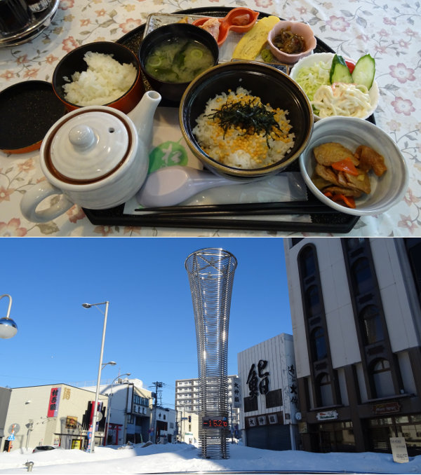 反対方向には結氷した網走湖が。ワカサギ釣りの名所だけど、寒い中、氷の上で釣りをするのは楽しいのかね。ワカサギを釣ったところで魚の調理の仕方を知らないから処分に困るんだよな。『ワカサギの活け作り』なんて言ってハラワタも取り除いていないワカサギを丸呑みにする蛮勇も持ち合わせてないし。うん。ワカサギ釣りはパス。