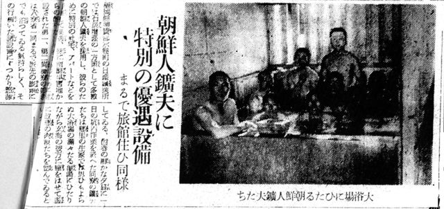 오사카 아사히 신문은, 쇼와 15년 4월 21 일자중선판(한반도 중부)으로「한국인 광부에 특별한 우대 설비 마치 여관주히(두매) 같이」를 찾아내에, 후쿠오카현 미즈마키마치의 탄광의 광업소가, 한국인 노동자 전용으로 신축의 사택과 아파트를 건설했다고 알렸다.기사에는, 욕조에 익는 한국인 노동자의 만족인 사진도 게제하고 있어, 한국 정부가 주장하는「강제 노동과 인권 유린의 현장」란, 만큼 먼 인상을 준다.