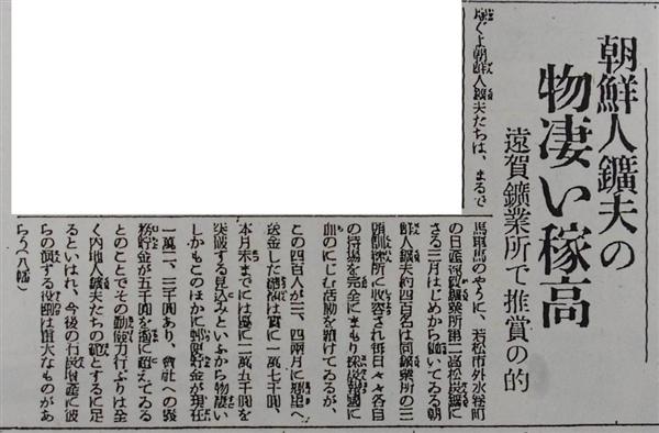 15年5月28日付の南鮮版(朝鮮半島南部)も、「朝鮮人鉱夫の物(もの)凄(すご)い稼高」の見出しを取って、同県北部の炭鉱で働く半島出身者の高賃金を記事にした。