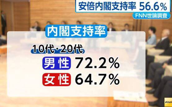 FNN가, 18일까지의 2일간에 간 여론 조사로, 아베 내각을 「지지한다」라고 대답한 사람은, 8월부터 1.2포인트 증가하고, 56.6%, 「지지하지 않는다」사람은, 0.2포인트 증가하고, 33.3%였다.