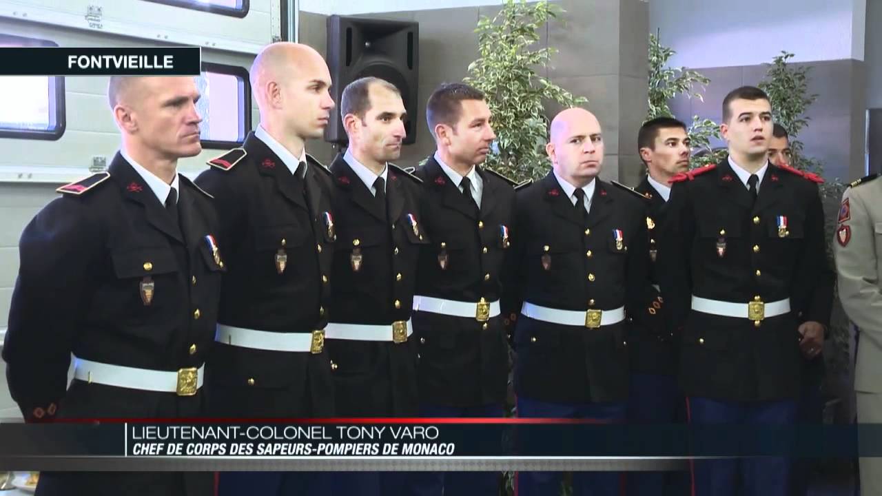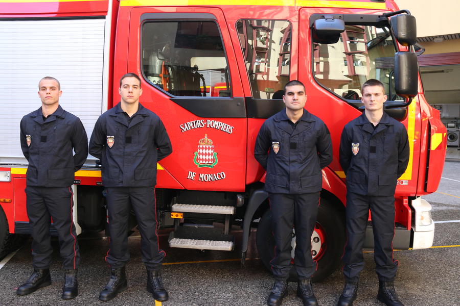 소방 차량 옆에 부동자세로 서있는 모나코 소방대원들