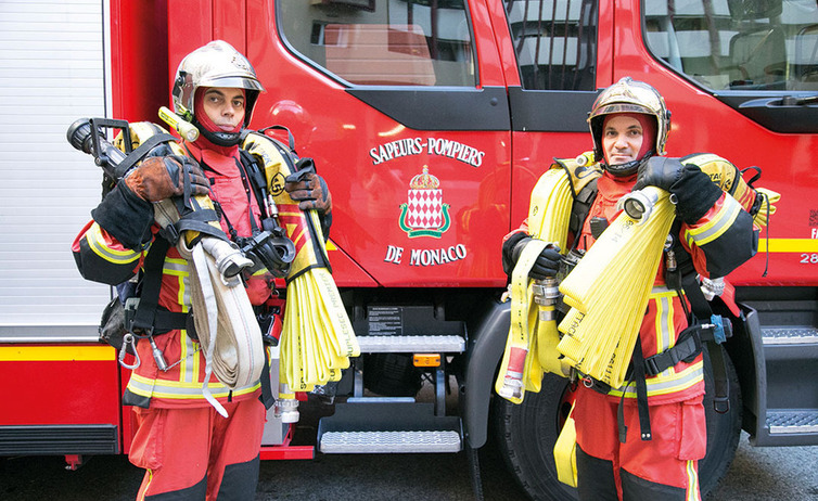 소방 호스를 어깨에 메고 있는 모나코 구조대원들