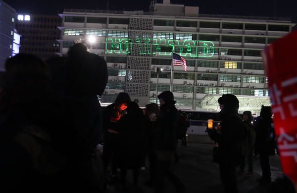 で開かれた中で、一部のデモ隊が米国大使館の建物にTHAAD(高高度ミサイル