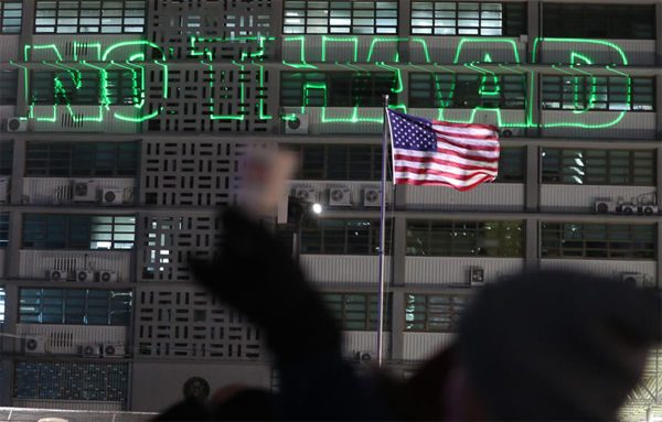 韓国デモ隊、アメリカ大使館にレーザービーム照射