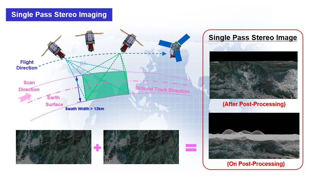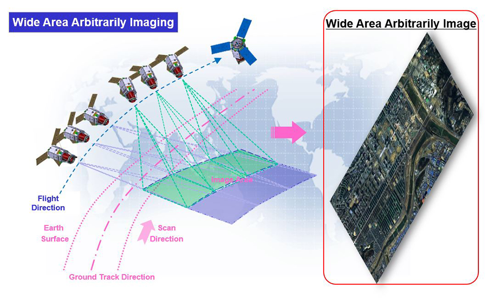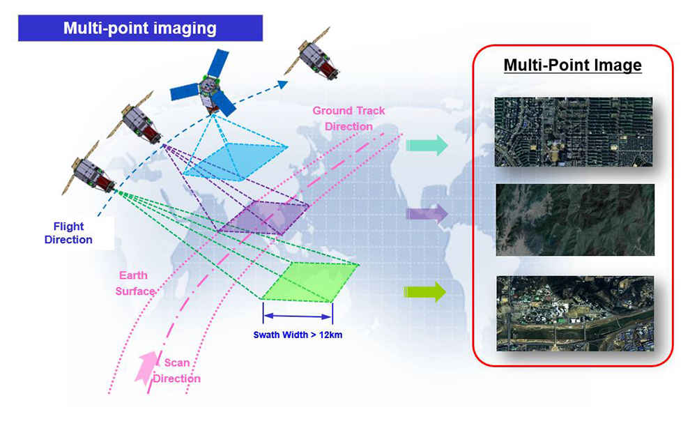 その外に衛星機動を利用して, 多重地域(Multi-point) 撮影モード, シングルパスステレオ(Single Pass Stereo) 撮影モード, 壙誌役(Wide area along) 撮影モード, 任意の壙誌役(Wide area arbitrarily) 撮影モードを支援することができる. 多重地域(Multi-point) 撮影モードは短いひまを見て何回衛星姿勢を調整して移動経路周辺地域映像を獲得する方式だ. シングルパスステレオ(Single Pass Stereo) 撮影モード衛星経路に付いて特定地域を何回取る方式だ. 映像を後処理すれば 3次元地形情報が作られる. 壙誌役(Wide area along) 撮影モードは衛星経路に位した地域を撮影後衛星姿勢を調整してそばの地域を撮影する方式だ. 任意の壙誌役(Wide area arbitrarily) 撮影モードは壙誌役撮影モードと似たり寄ったりだが衛星経路以外の特定地域を撮影する方式だ.