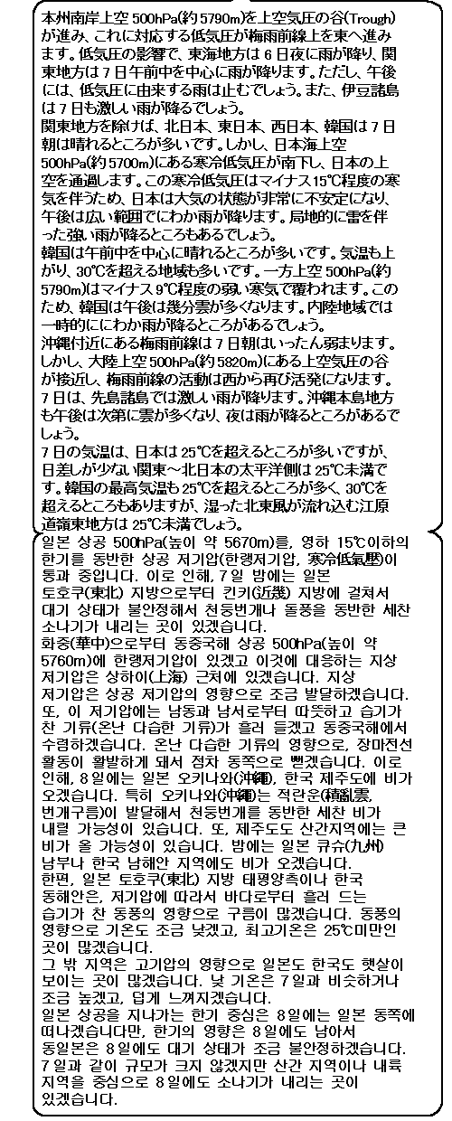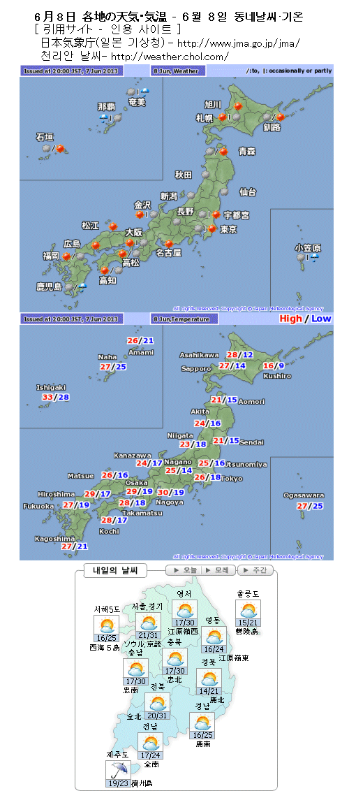 오키나와(沖繩)나 제주도는 비가 오겠고, 특히 오키나와(沖繩)는 세찬 비가 올 염려가 있어요. 그 밖 지역은 맑은 곳이 많겠어요. 기온이 높은 곳이 많아서 덥게 느껴지겠어요. 또, 기온이 그다지 높지 않은 지역도 습도가 높겠어요. 열사병에 조심하시기 바랍니다.