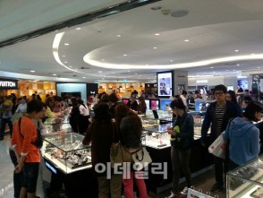 去る 2日ソウル小公洞ロッテ免税店時計コーナーに中国人観光客が陳列した商品を見ている.