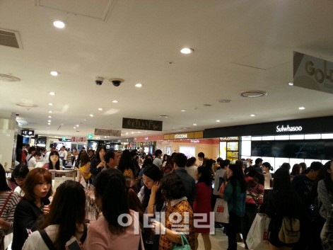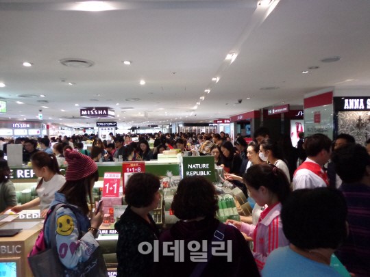 去る 2日ソウル小公洞ロッテ免税店入口は韓国化粧品ブランドを捜す中国人観光客たちにあふれる.