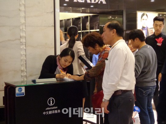 ロッテデパート本店 1階中国顧客対象案内デスクで通訳職員が中国人顧客たちの問合わせ事項に返事してくれている.