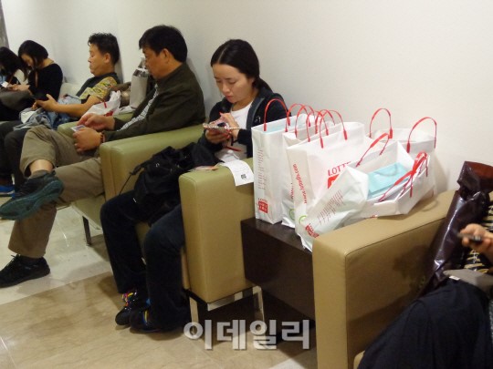 一中国人観光客が免税店で韓国化粧品をいっぱい購買した後しばらく休息を取っている.