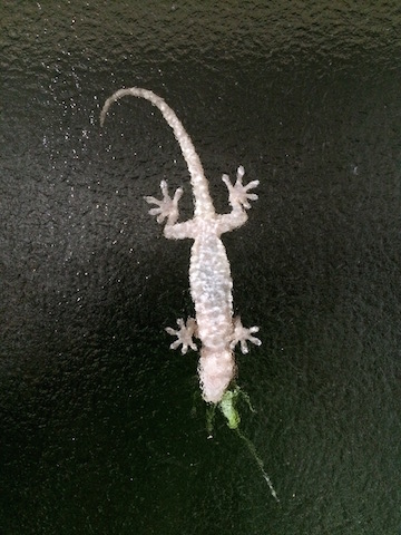 ヤモリがキリギリスを捕食していました